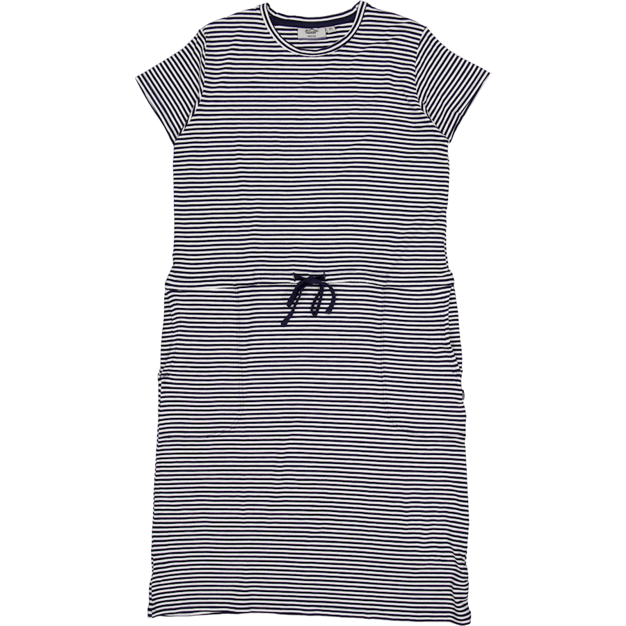 A lovely knee-length summer dress that fits perfectly at home in the garden or during a trip to the beach. The dress has a soft and stretchy material and is designed with stylish details such as a drawstring and sewn-in belt at the waist. It gives you the opportunity to adjust the fit and makes the dress a lovely everyday favourite. On the front of the dress you will also find two pockets, which gives the dress that extra little touch.
